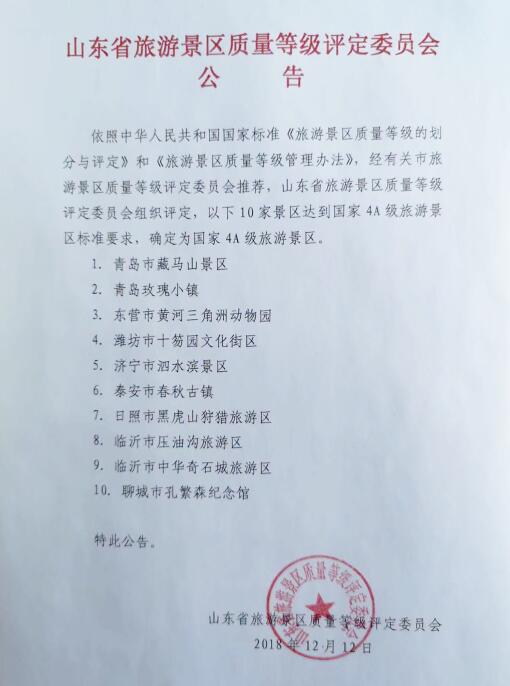 2018年12月12日,艾肯咨詢機構接獲喜報——由我機構提供服務的山東青島藏馬山項目通過了山東省旅游景區(qū)4A景區(qū)的評審。