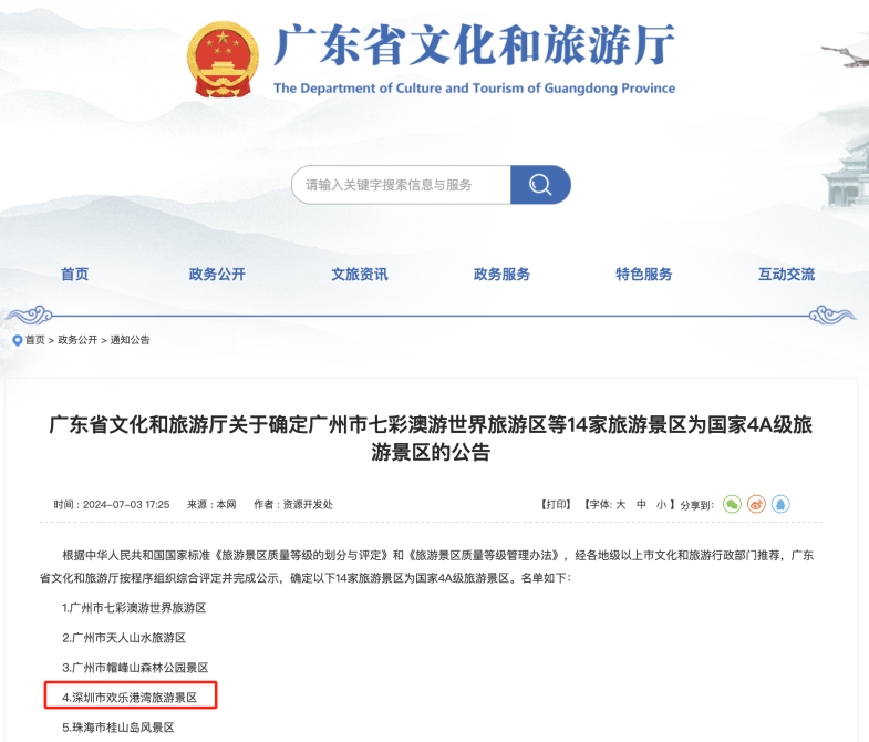近日,廣東省文化和旅游廳發(fā)布公告,按照《旅游景區(qū)質(zhì)量等級(jí)的劃分與評(píng)定》和《旅游景區(qū)質(zhì)量等級(jí)管理辦法》等國(guó)家級(jí)標(biāo)準(zhǔn)評(píng)審,歡樂港灣獲評(píng)“國(guó)家4A級(jí)旅游景區(qū)”。這是自2017年以來,深圳又一次新增獲評(píng)的國(guó)家4A級(jí)旅游景區(qū)。