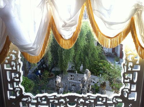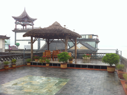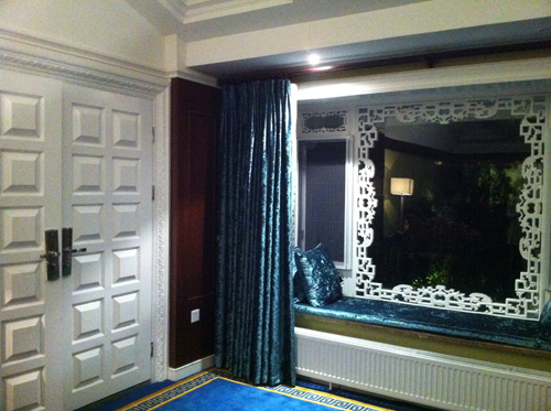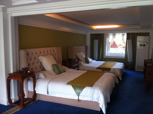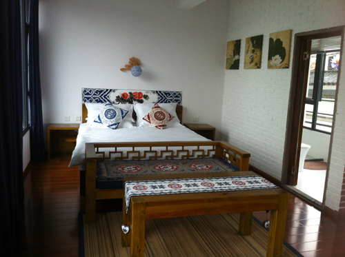 在我們疲憊一路托著沉重的行李包無意中尋找到這家客棧的時候,心中一陣驚訝,因為參觀完他的房間大家發現一個詞:大氣。這家客棧的主人似乎財力比較雄厚,房間布局十分大氣以至于某一個標間用了三個開間的房型,20平米的洗手間里還放立著清代圈椅,標間的兩張一米五的雙人床讓我們差異這不是定了標準間,而是真正的大床房。每間就連門廳里也矗立這柜式空調,小茶幾旁的沙發還是電動按摩的,大堂和客房里還不時的擺放著各類收藏,可見老板是一個有愛好的人。這家客棧最重要的風格寫照就是這個詞:中西合璧。一進小院就可以看到不大的院落布置著中式園林,小橋流水,亭臺鳥叫,而鏤空的中式門窗上卻有改以往紅木色的傳統中式門窗顏色,用了非常西式的白,推門進屋更加發現各式歐式絲絨沙發、床頭。轉過頭來卻又看到中國古典家居中赫赫有名的床榻和圈椅。這就是這家客棧的主題與風格,應趁現在流行的一句話就是:高端大氣上檔次。