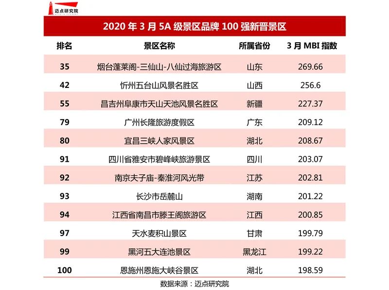 以下是邁點(diǎn)研究院獨(dú)家發(fā)布的“2020年3月5A級(jí)景區(qū)品牌100強(qiáng)榜單”。本月華中地區(qū)增幅顯著,黑龍江湖南新疆熱度增加;超五成景區(qū)排名上升,山水型、湖泊型景區(qū)漲幅明顯;MBI指數(shù)超八成上升,西藏山西增幅顯著;無(wú)錫黿頭渚景區(qū)、廣州長(zhǎng)隆旅游度假區(qū)、拉薩布達(dá)拉宮景區(qū)及武漢黃鶴樓公園在各細(xì)分維度表現(xiàn)最為優(yōu)異。